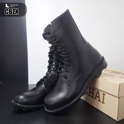 รองเท้าคอมแบท ทรง US หนังขัดมันพรีเมี่ยม ลิ้นหนังแบบปิด ซับด้านในนุ่ม ขอบบุนวม พื้นรถถังแบบมีโลโก้ "SRICHAIGROUP" เสริมแผ่นไฟเบอร์แบบหนา